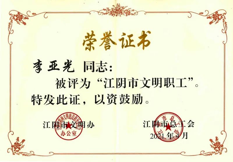 21年春,由江陰市精神文明建設(shè)指導(dǎo)委員會辦公室, 江陰市總工會聯(lián)合發(fā)起的評選中,江蘇雙良鍋爐有限公司李亞光獲評“江陰市文明職工”。這不是他第一次獲獎,1998年至2008年連續(xù)11年被評為“公司先進工作者”,2010年被評為“利港鎮(zhèn)先進工作者”、“集團能源管理先進工作者”,2014年被評為“集團十佳員工”,2015年被評為“江陰市優(yōu)秀職工”,“空氣壓縮機管路改進”獲評“臨港經(jīng)濟開發(fā)區(qū)合理化建議一等獎”,2016年被評為“無錫市五一創(chuàng)新能手”;2017年液壓U型管水壓工裝獲評雙良集團2016年度十大合理化建議獎,2018年獲評2017年度利港工匠,液壓U型管水壓工裝獲評利港科技之星。